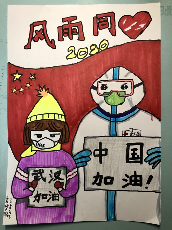 创作理念:画面中穿着防护服的李文亮医生和戴着口罩的小学生并肩而立,一起为武汉加油,为中国加油!