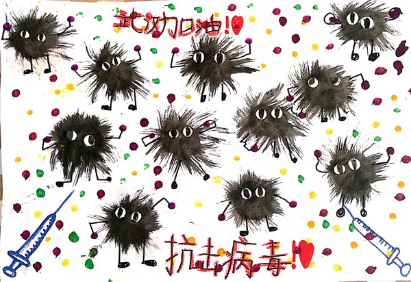 创作理念:这幅是用水彩颜料牙刷棉棒等工具创作的儿童创意画,可恶的新型冠状病毒危害人们的健康,医生们一定会研制出厉害的药物,把它们彻底消灭掉!抗击病毒,武汉加油!