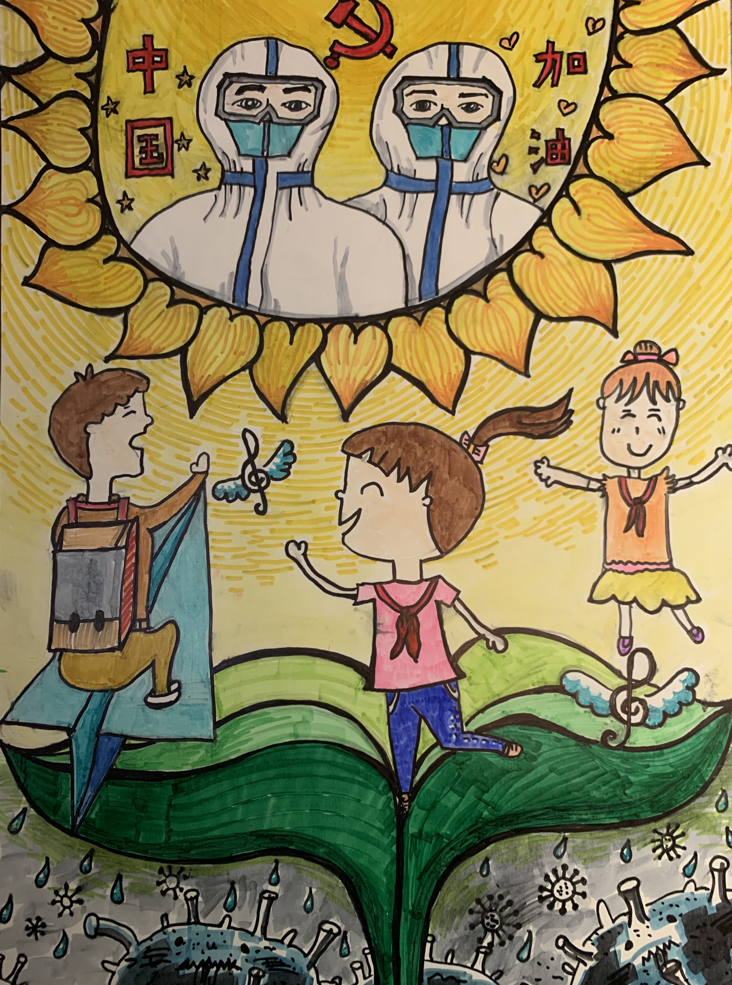 创作理念:不管冠状病毒多么凶猛厉害,只要我们大家团结一下,心中充满爱,世界就会充满温暖的阳光。英勇无畏的医护人员和强大的祖国都是我们的太阳~我们一定能战胜病毒,迎来美好的春天。