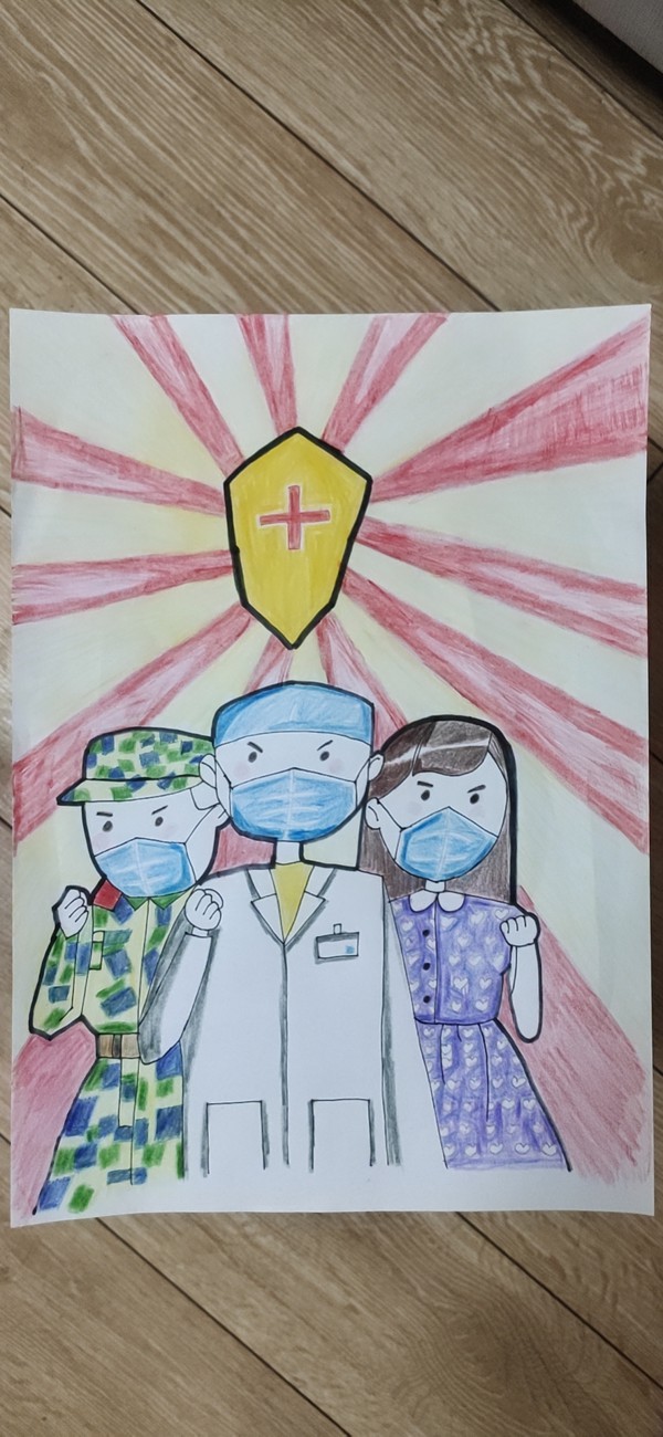 创作理念:抗击疫情是一场全民战争,伟大祖国一声召唤,中华儿女全心投入。作品中的“红十字”散发耀眼的光芒,代表着光荣的广大医务工作者和伟大的医疗事业。穿白大褂、站在中间的是医生,他们不辞辛苦、不惧危险,英雄般的战斗在“抗疫”第一线;左边穿迷彩服的是人民解放军,他们牢记使命、勇往直前,危难之时再显身手,是抗击疫情的重要力量;右边穿裙子的小姑娘代表普通老百姓,他们积极响应祖国号召、洁身自好、严防死守。医生、军人、老百姓,他们神态肃穆、紧握拳头、团结一致,以必胜的信念同疫情作斗争。