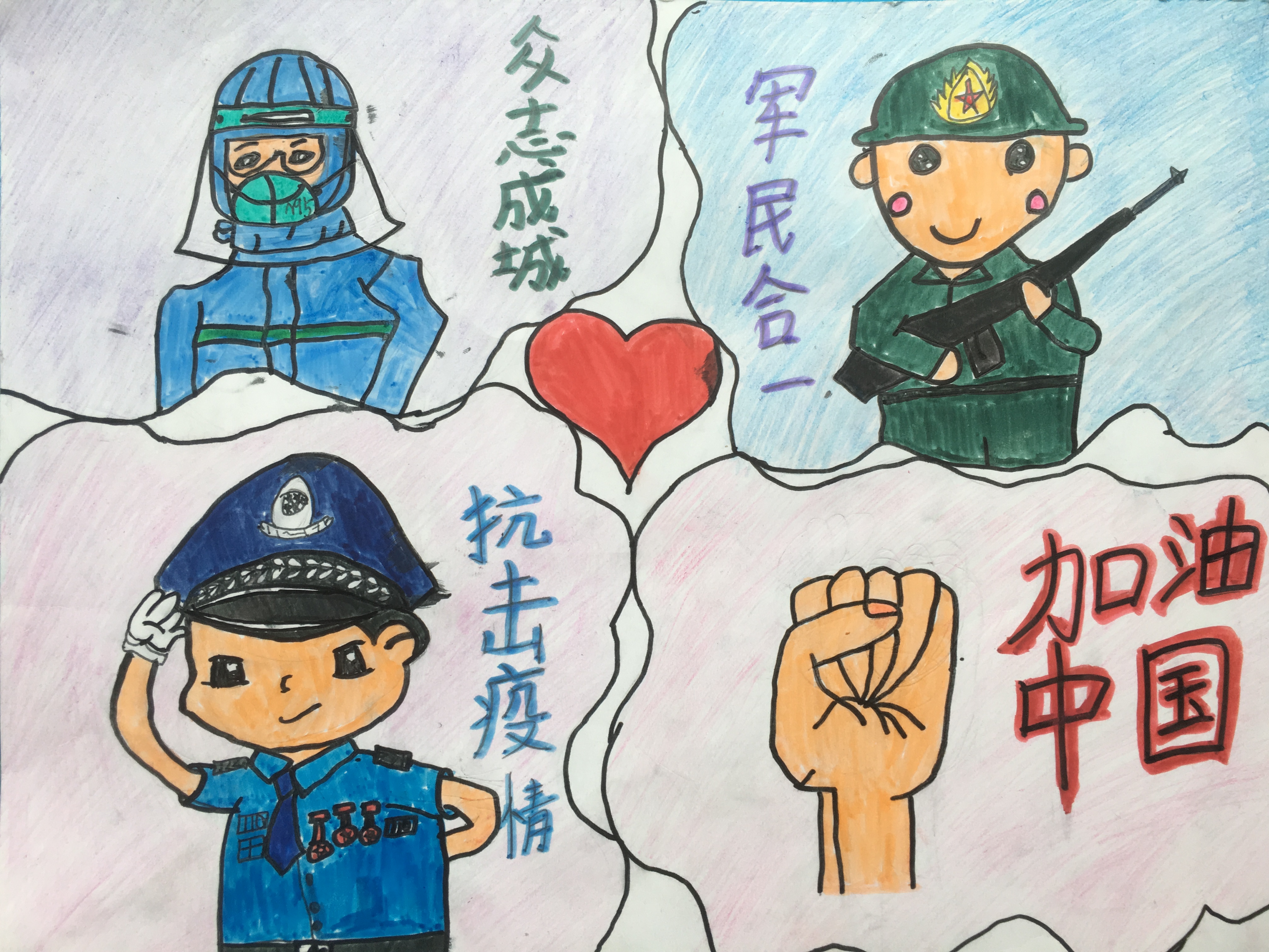 创作理念:军民合一,抗击疫情。疫情当前,人人有责。抗战在一线的叔叔阿姨们:你们辛苦了 !相信在你们坚持不懈的努力下,再可怕的病毒也会很快被消灭,疫情很快就会过去。也希望你们能早日与家人团聚。我在青岛为你们加油!武汉加油,中国加油!