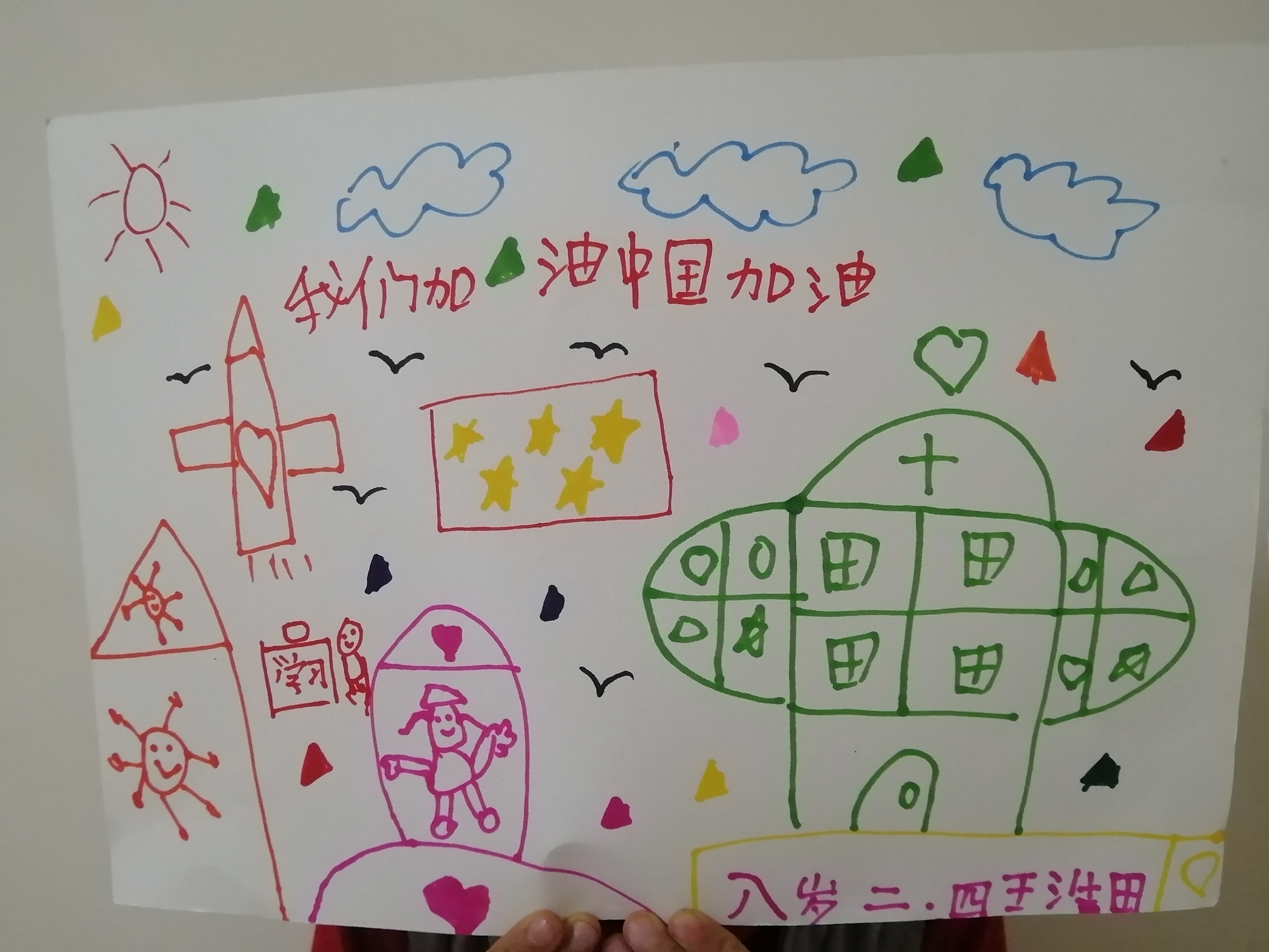 创作理念:新冠 病毒,我们小朋友呆在家里,努力学习,就是给祖国加油。我们不能医治病人,但是我们呆在家里不出去,用心给武汉加油,中国加油。
