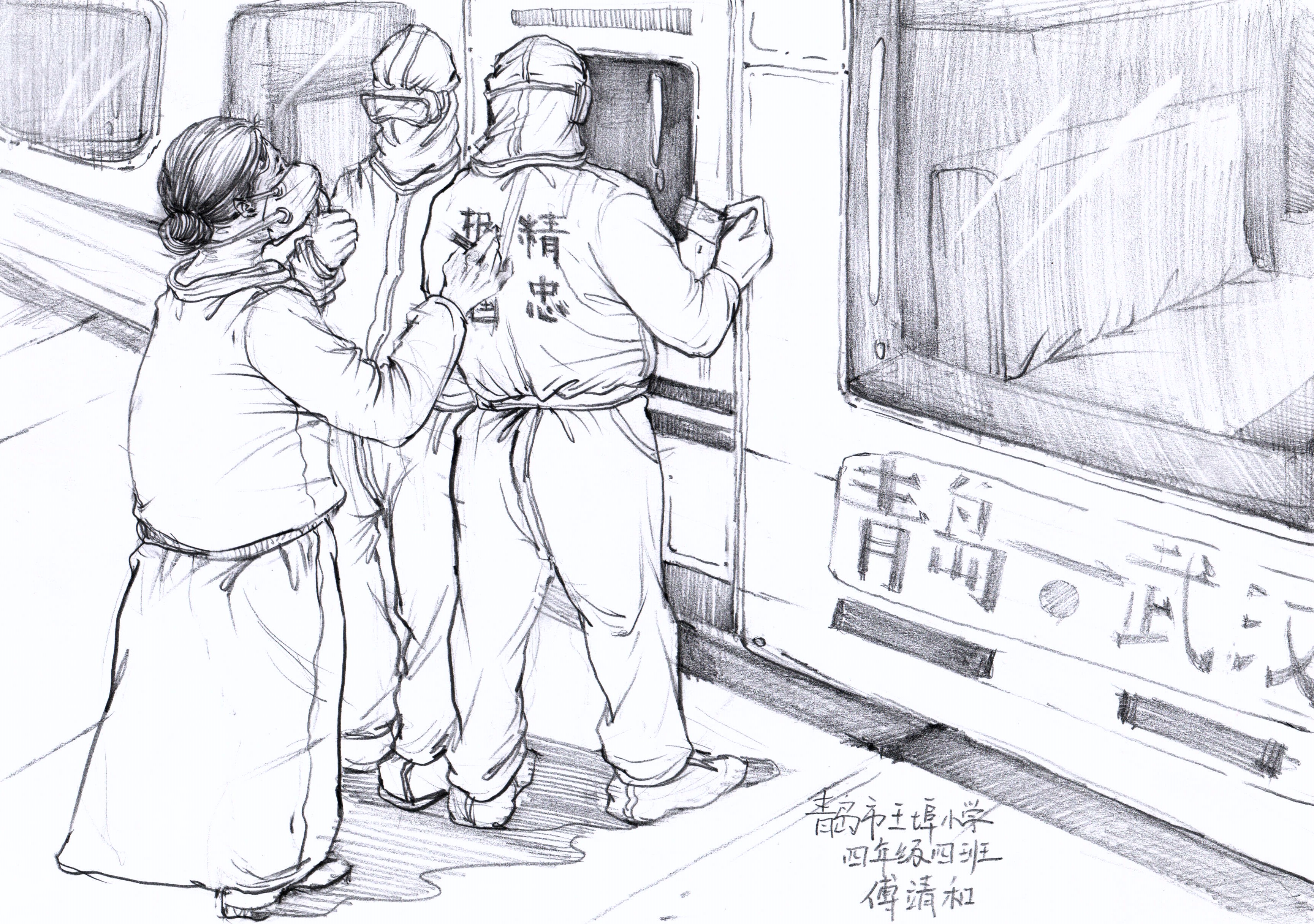 创作理念:在青岛驰援武汉医疗队员即将出发的一刻,一位年逾七旬的老母亲,叫住自己儿子,用唛头笔在他背后郑重写下“精忠报国”四个大字。临行时对他说:“现在国家面临疫情危险,到武汉后你要竭尽忠诚,随时准备牺牲一切!”
