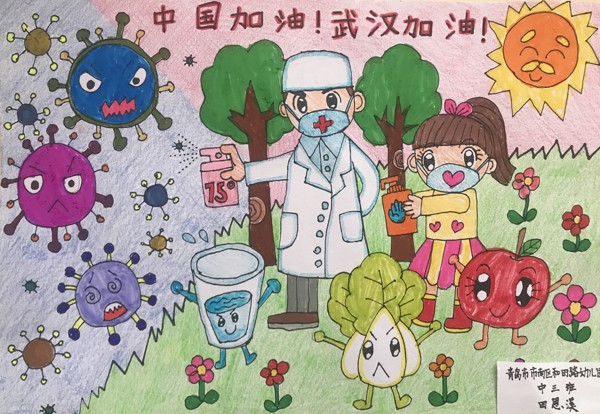 创作理念:我们小朋友要多吃水果,蔬菜,多喝水,勤洗手,常通风,听大夫叔叔的话,少出门,出门一定带口罩,让我们大家一起努力早日打败病毒。武汉加油,中国加油!